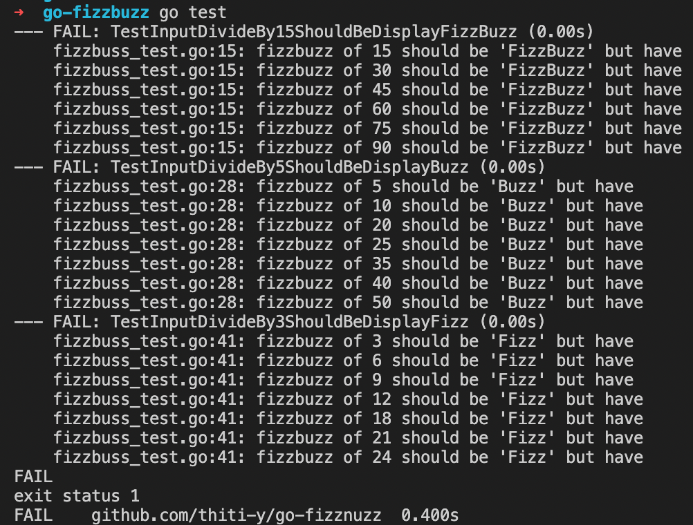 จะเห็นว่า Test Fail เนื่องจากเรายังไม่ได้ Implement function Fizzbuzz เลย